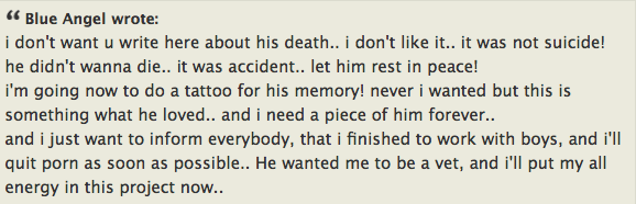 Blue Angel has said she will stop doing b/g and will retire from porn 'as soon as possible' due to the death of her ex-boyfriend Greg Centauro (who was also a porn performer).
